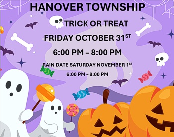 Hanover Township Trick or Treat will be held on FRIDAY, OCTOBER 31ST from 6:00 PM – 8:00 PM